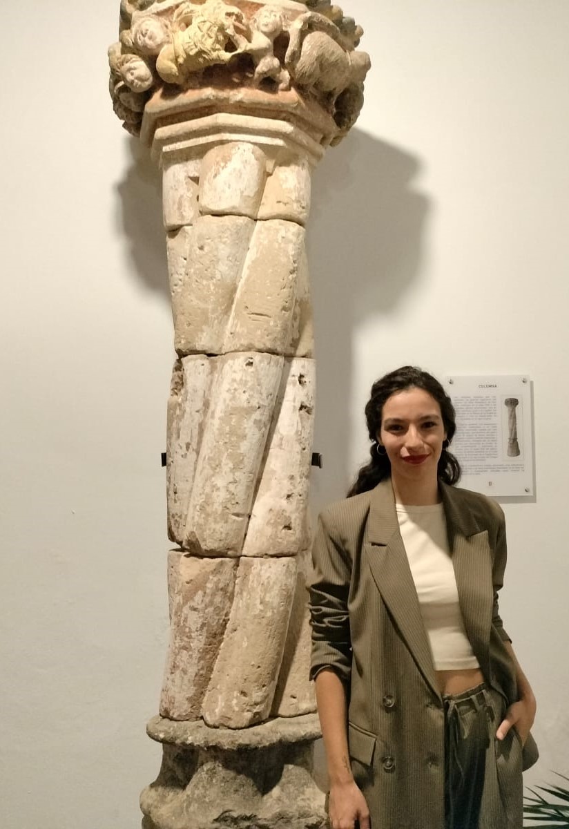 María Aguilera junto a una de las columnas originales del claustro del antiguo convento de San Zoilo,