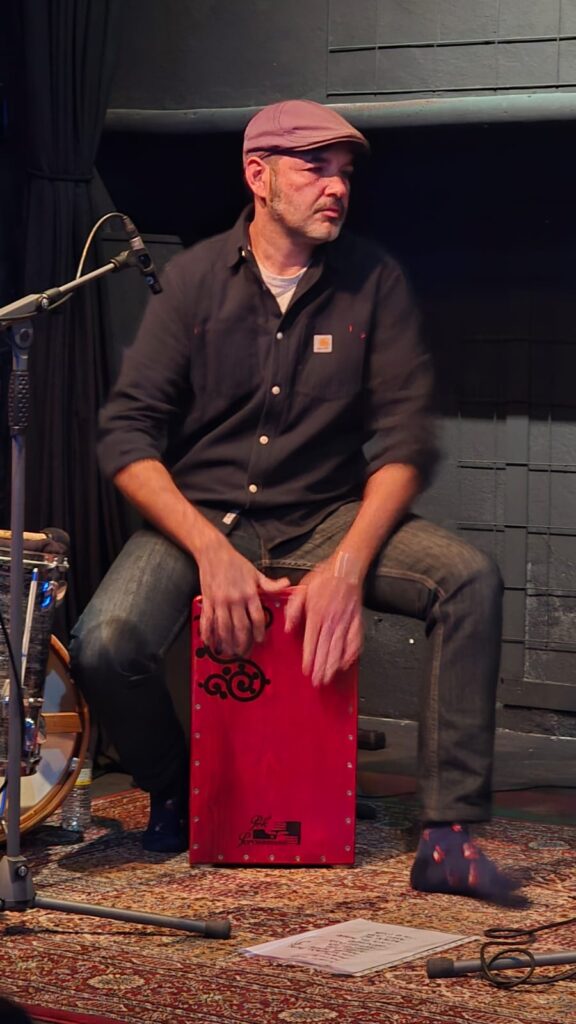 Gabi Zurita golpea el cajón en un latido terrestre que hace vibrar la sala. La tinaja resuena con un eco profundo; el pandero chispea con precisión de relámpago. Sus distintos artilugios inventados lanzan ritmos inesperados, mientras sus palmas marcan caminos invisibles que acompañan la escena.
