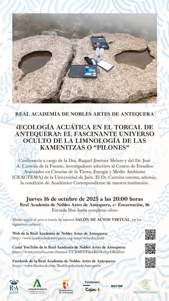 Nos envía La Real Academia de Nobles Artes de Antequera su placer de invitarnos a la conferencia titulada “¿Ecología acuática en El Torcal de Antequera?: el fascinante universo oculto de la limnología de las kamenitzas o “Pilones””, a cargo de la Dra. Raquel Jiménez Melero y del Dr. José A. Carreira de la Fuente, investigadores adscritos al Centro de Estudios Avanzados en Ciencias de la Tierra, Energía y Medio Ambiente (CEACTEMA) de la Universidad de Jaén. El Dr. Carreira ostenta, además, la condición de Académico Correspondiente de esta institución antequerana.