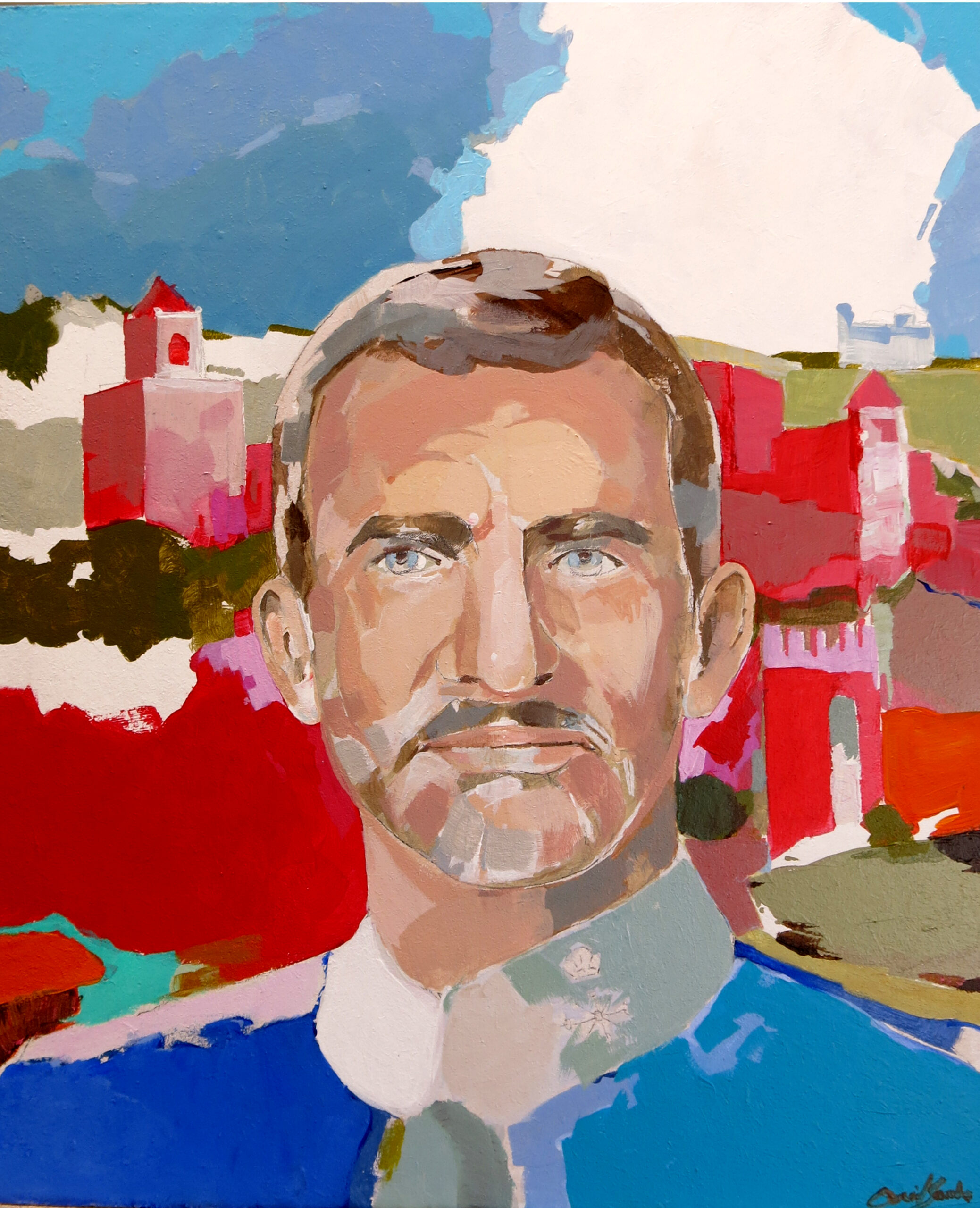 Retrato del Rey Felipe VI, con fondo de una vista de Antequera, con el castillo o la alcazaba, símbolo de poder e historia.