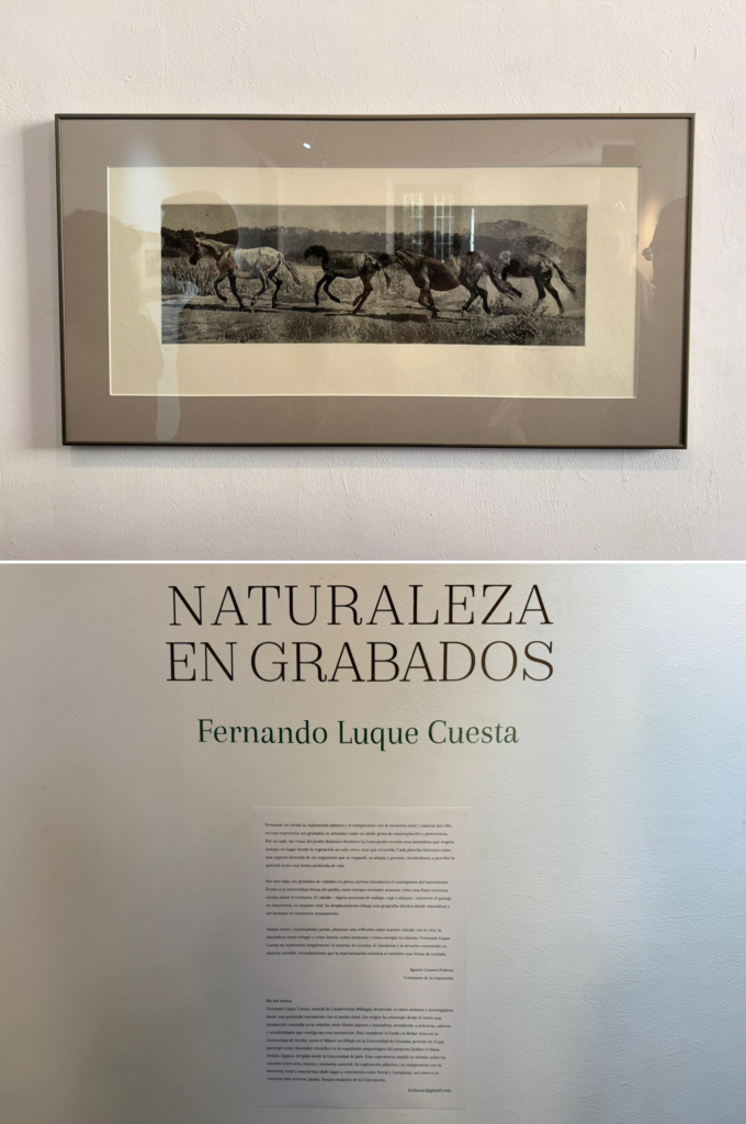 Pero la exposición no se limita a la contemplación tranquila. Entre las imágenes del jardín, irrumpen con fuerza los caballos de Romero Benítez, captadas a plena carrera, figuras que rompen la quietud y nos recuerdan que la naturaleza también es movimiento, energía, impulso. Estos grabados son un contrapunto vibrante que dota de ritmo a la muestra y plantea una pregunta: ¿puede la naturaleza ser contenida? ¿O su esencia es precisamente la libertad que Luque plasma en cada trazo?