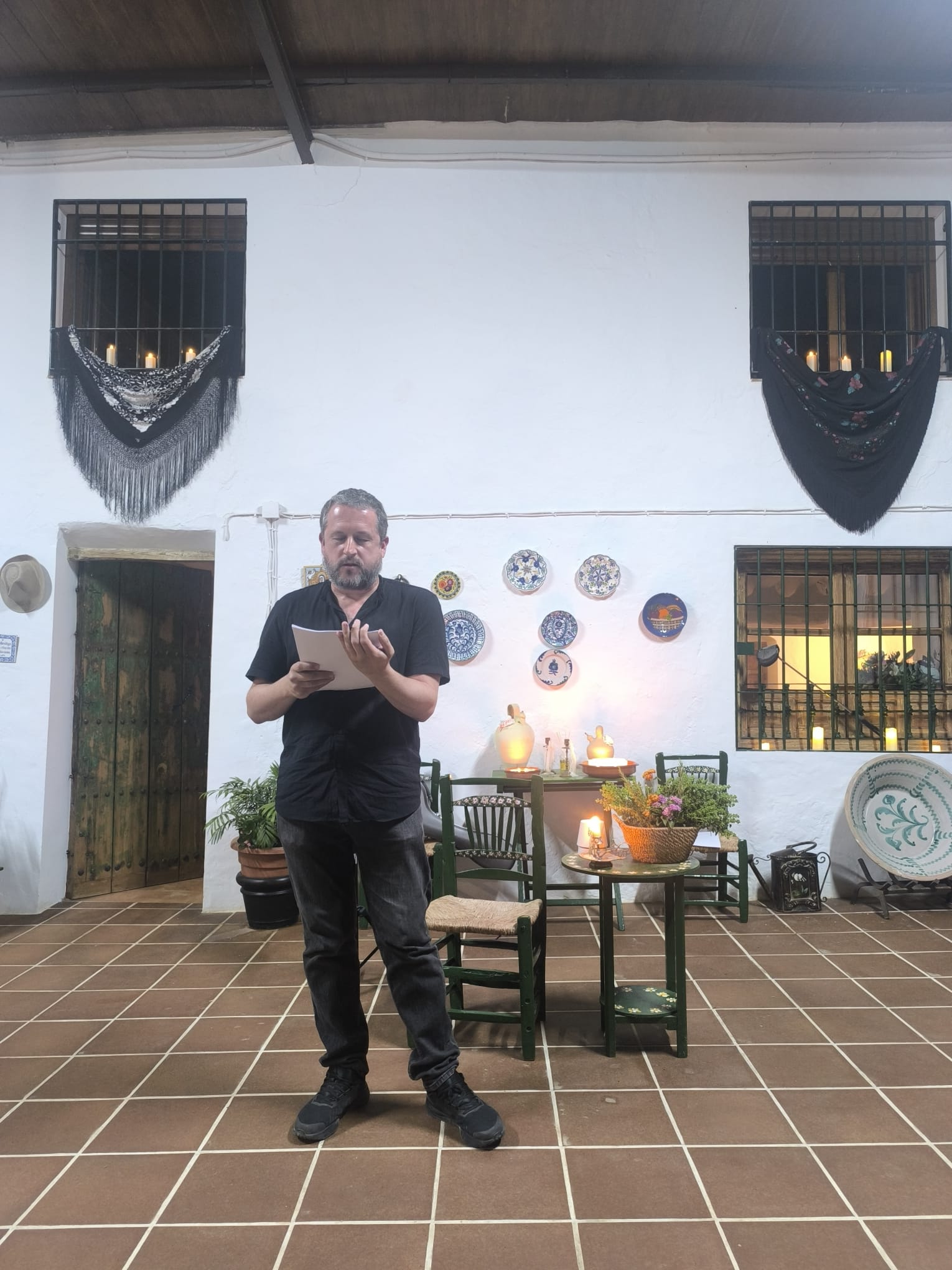 Juan López Rama, profesor y maestro de sensibilidades en la escritura y la literatura, abrió el acto con una delicada introducción a los Sonetos del amor oscuro, desnudando su profundidad y su valentía poética, como quien despliega pétalo a pétalo el alma de un poema. Nos llevó a los asistentes por la mirada de estos versos y en la importancia, casi oculta, de estos fragmentos poéticos de la obra de García Lorca.