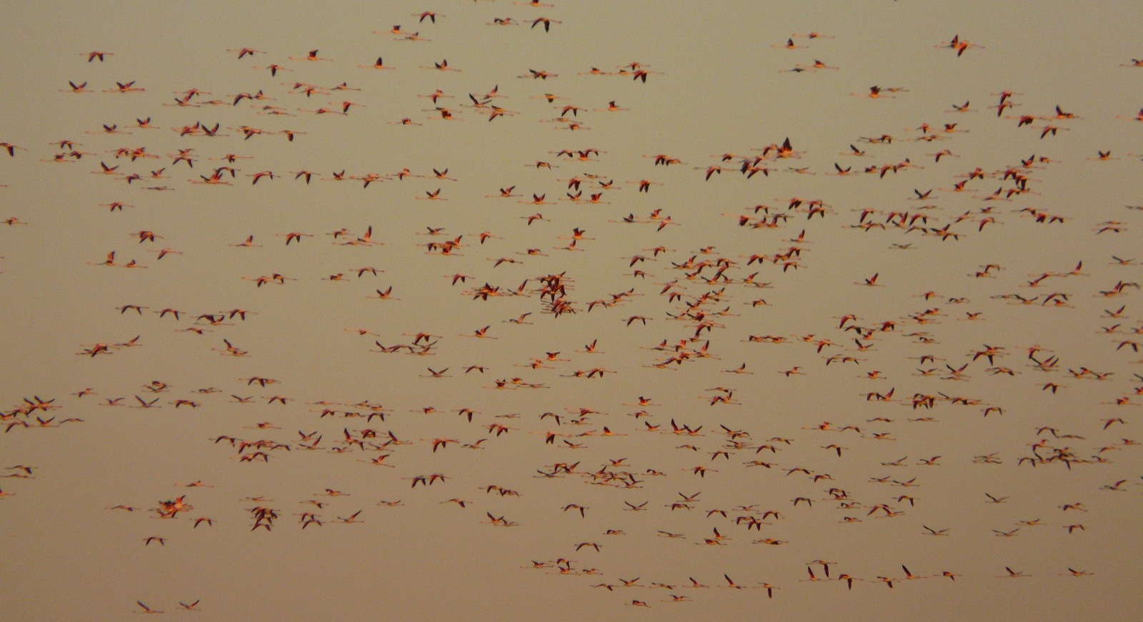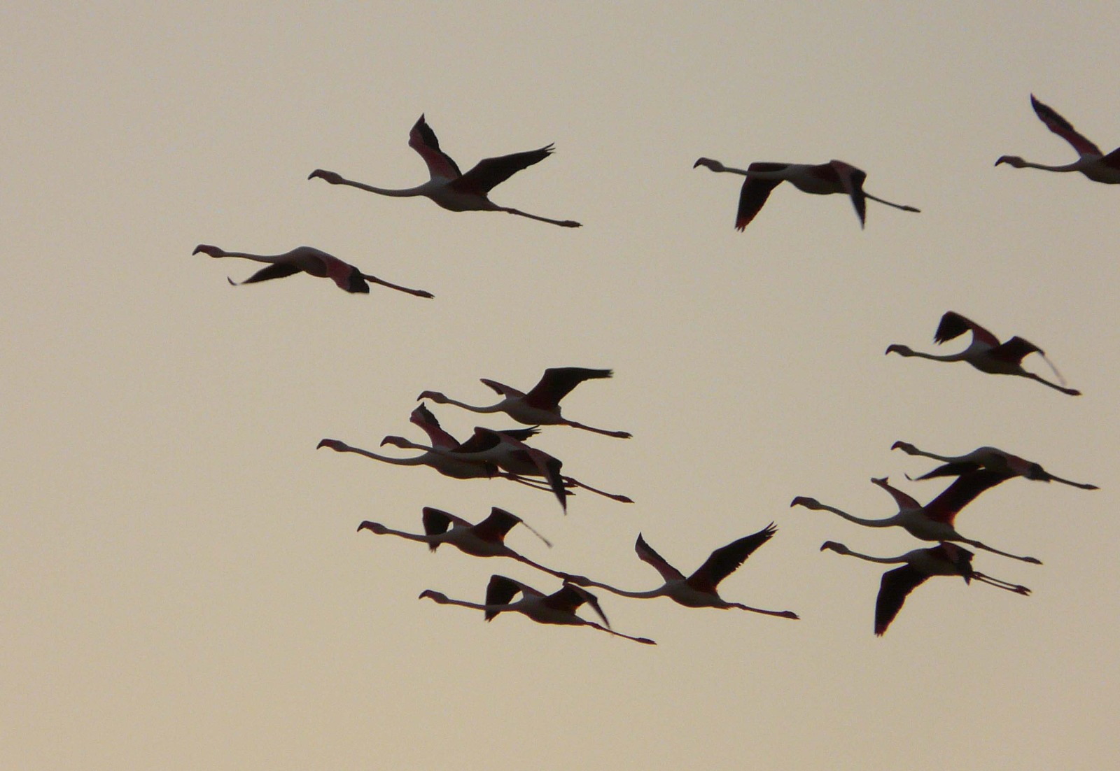 Observadores habían contado que la noche anterior un gran bando de flamencos adultos arrancó a volar, como sucedía puntualmente cada anochecer. Era un momento muy intenso, con aquella excitante algarabía de graznidos que sonaban aquí y allá. En medio de un contagioso y sugestivo espíritu gregario, la emoción de la colonia iba in crescendo, con la expectativa de un vuelo inminente que se aprestaban a acometer, prometiéndose kilómetros de viaje en busca de alimento a lejanas salinas y marismas costeras, a cientos de kilómetros.